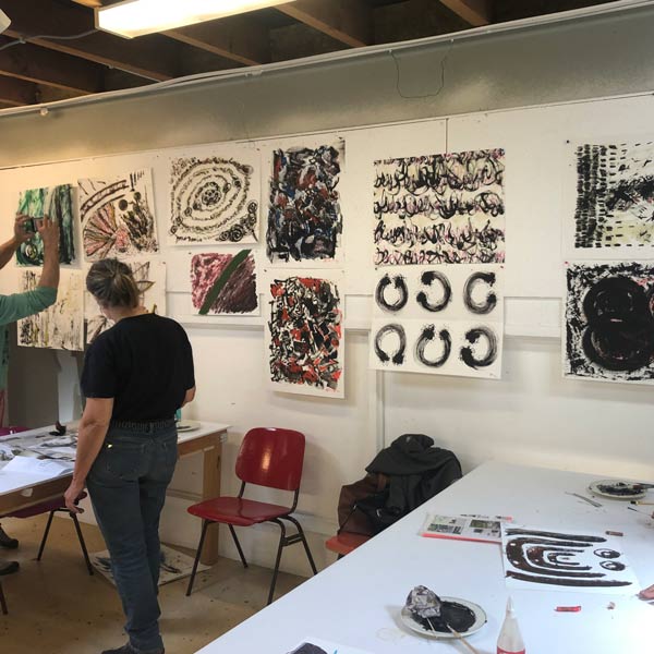 Realistische en klassieke teken en schildertechnieken komen hier niet aan te pas. De relatie tussen je eigen lichaam, het materiaal waarmee je werkt en je papier/doek staat centraal. Je gaat de beweging opzoeken in je werk.
