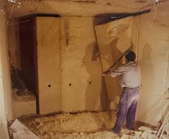 Op plaatsen waar geschikte kalksteen aan de oppervlakte kwam begon men met het uitbreken van de blokken, horizontaal de steile wand in. Op die manier hoefden de bovengelegen lagen en bossen niet te worden verwijderd. Als men eenmaal een geschikte plaats had gevonden, (Soms was het nodig om eerst een tunnel te metselen voor men de geschikte kalksteen bereikte) begon men mergelblokken over een breedte van ongeveer 3 meter uit de wand te zagen. Breder kon men de gang niet maken omdat dan het plafond zou instorten.
